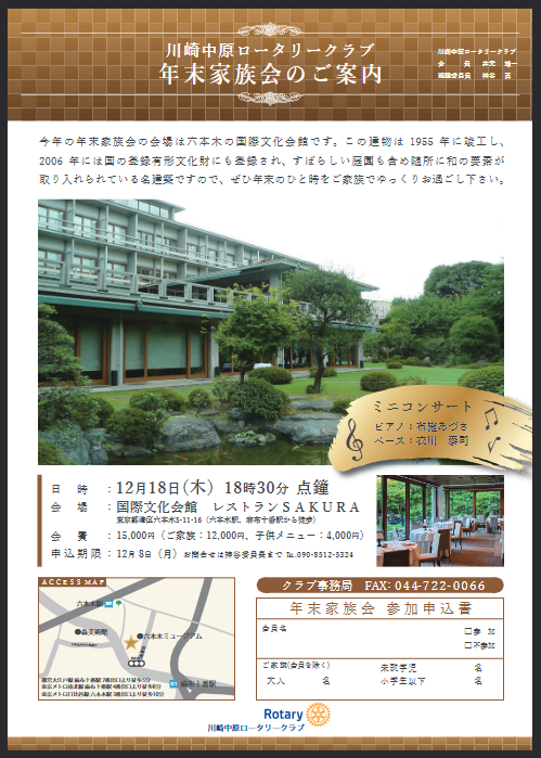 今年も川崎中原ロータリークラブの一年を締めくくる「年末家族会」を開催いたします。